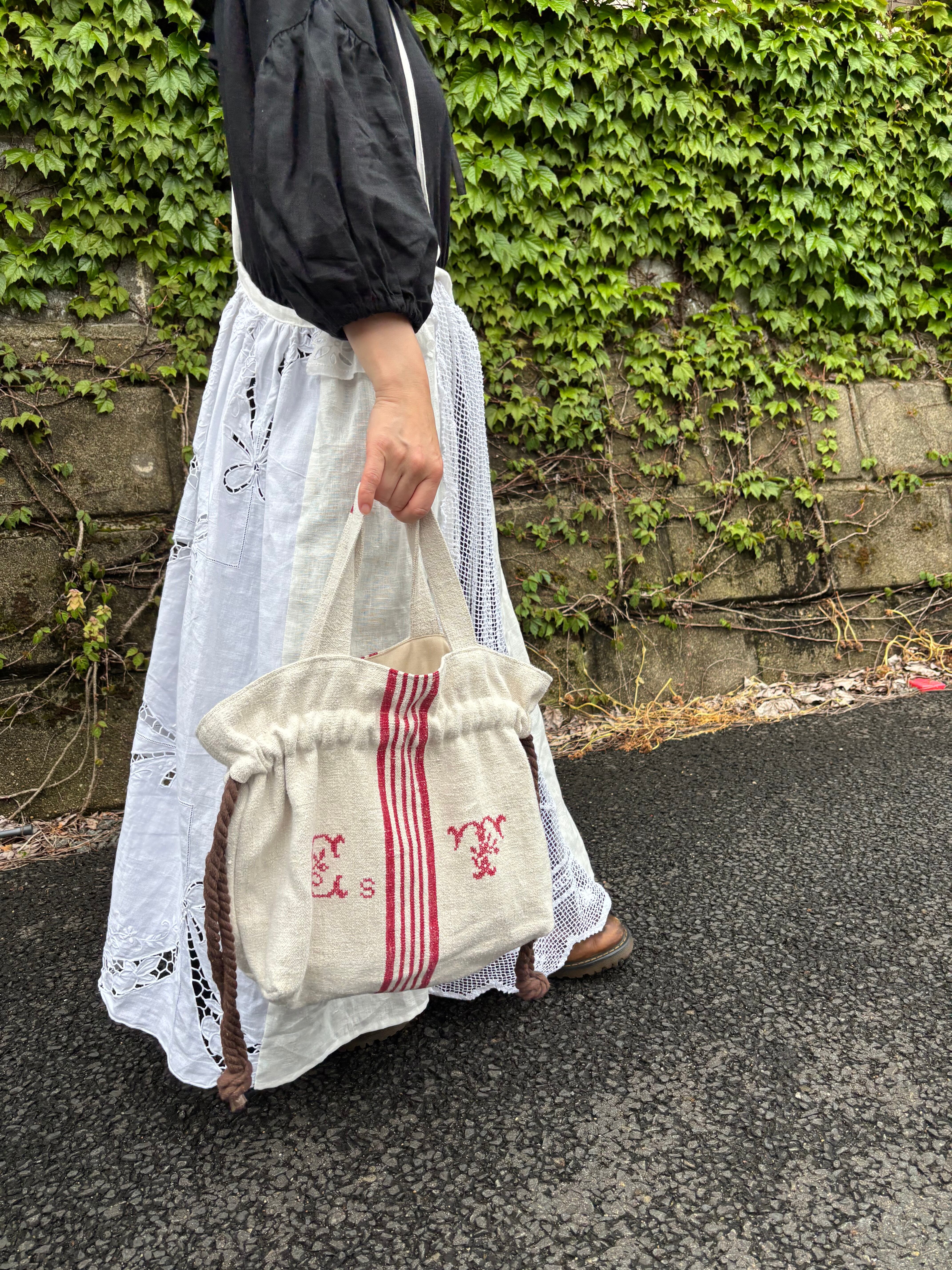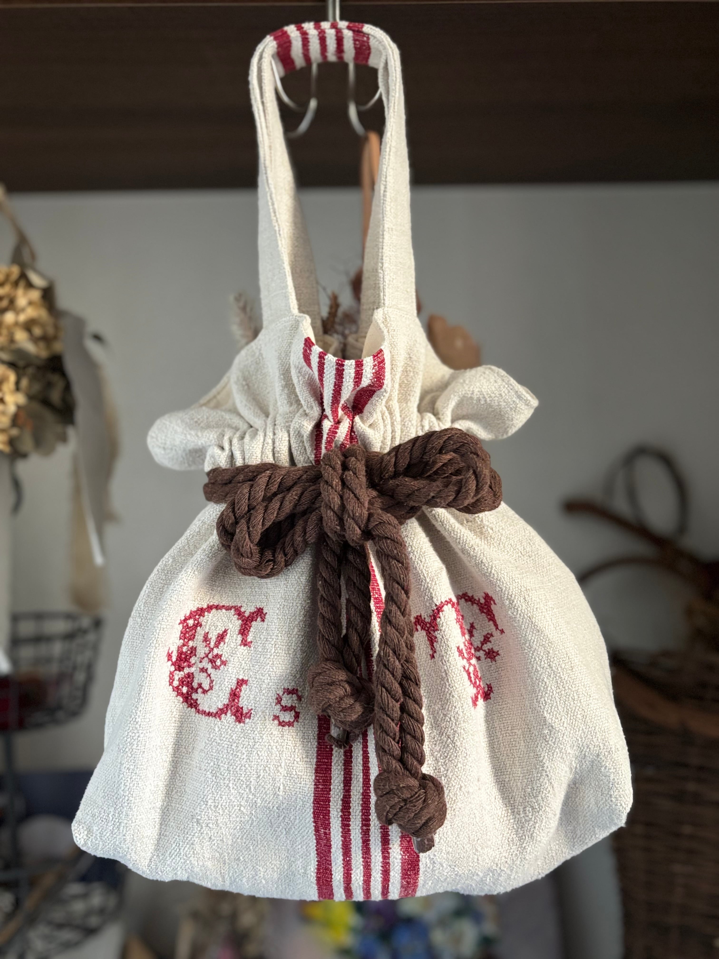 魅力的なアンティークリネンを使用し、特別なモノグラム刺繍が施されたコロンとした形の巾着バッグが新登場!ナチュラル素材の柔らかい手触りに、珍しい3文字のイニシャル刺繍がアクセントとなり、他にはない特別感を演出します。このデザインは、シンプルなコーディネートにも華やかさをプラスしてくれるでしょう。