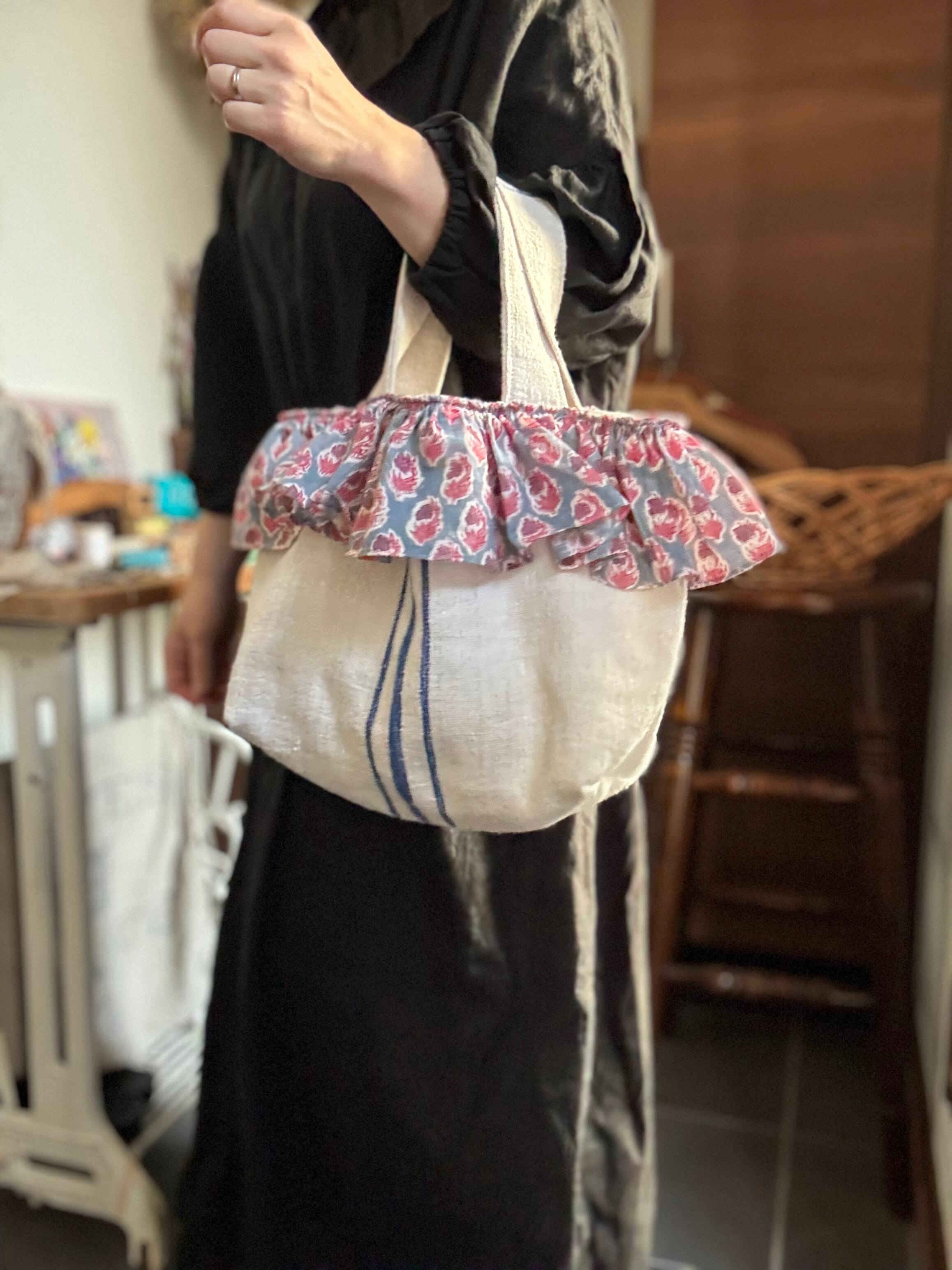 新たに登場した大人かわいいフリルトートは、ヨーロッパのグレインサックとインドのブロックプリントが素敵にコラボレーション!自然素材を使用し、心地よい風合いを楽しむことができるアイテムです♡このトートは、唯一無二の魅力を持ったデザインで、あなたのコーディネートに特別なアクセントを加えることでしょう。