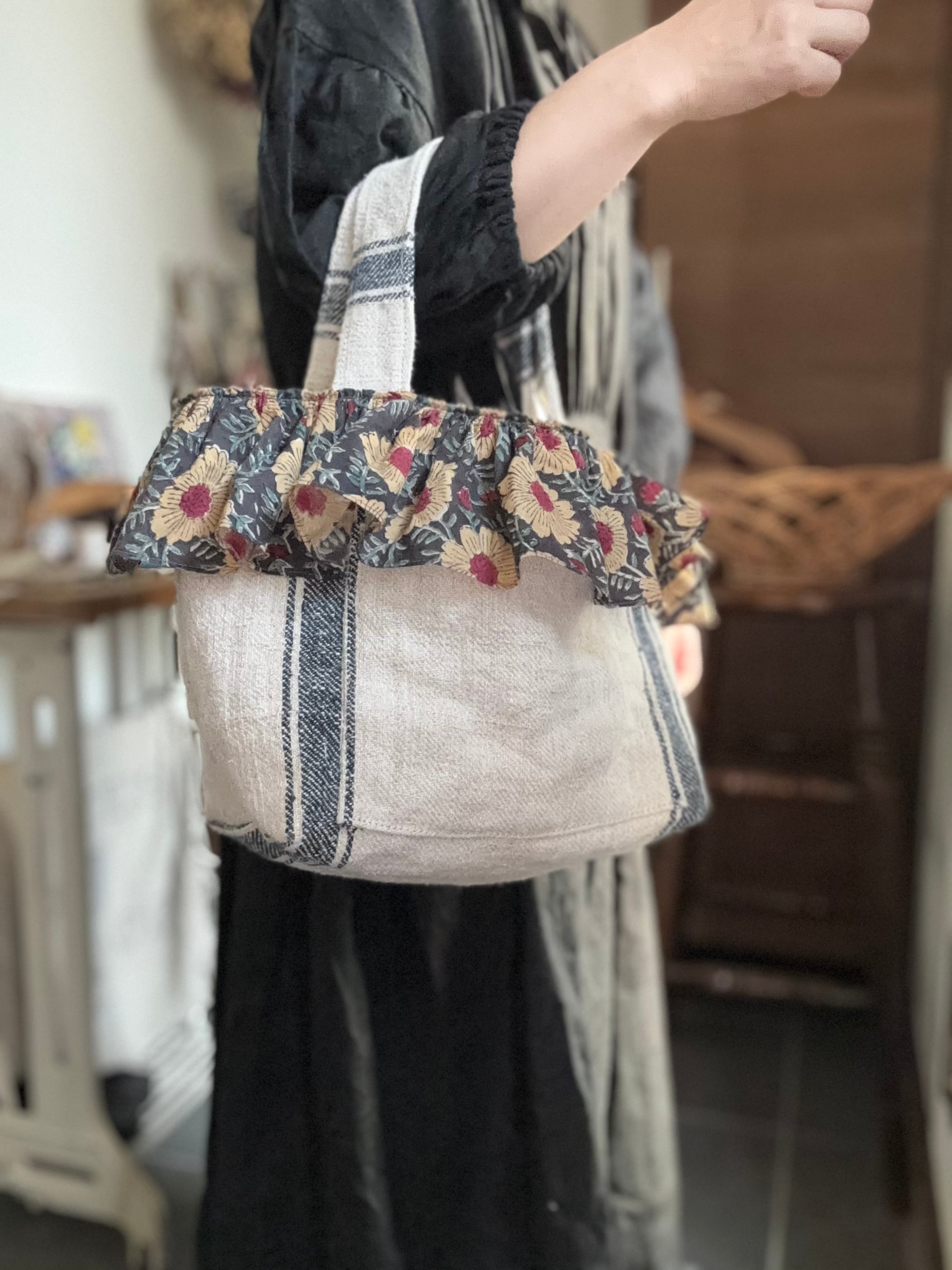 新登場の大人かわいいフリルトートは、ヨーロッパのグレインサックとインドのブロックプリントが美しく融合したアイテムです!自然素材で作られたこのトートは、心地よい風合いを楽しみながら、唯一無二の魅力を持ったデザインで、あなたのコーディネートに特別なアクセントを加えます♡