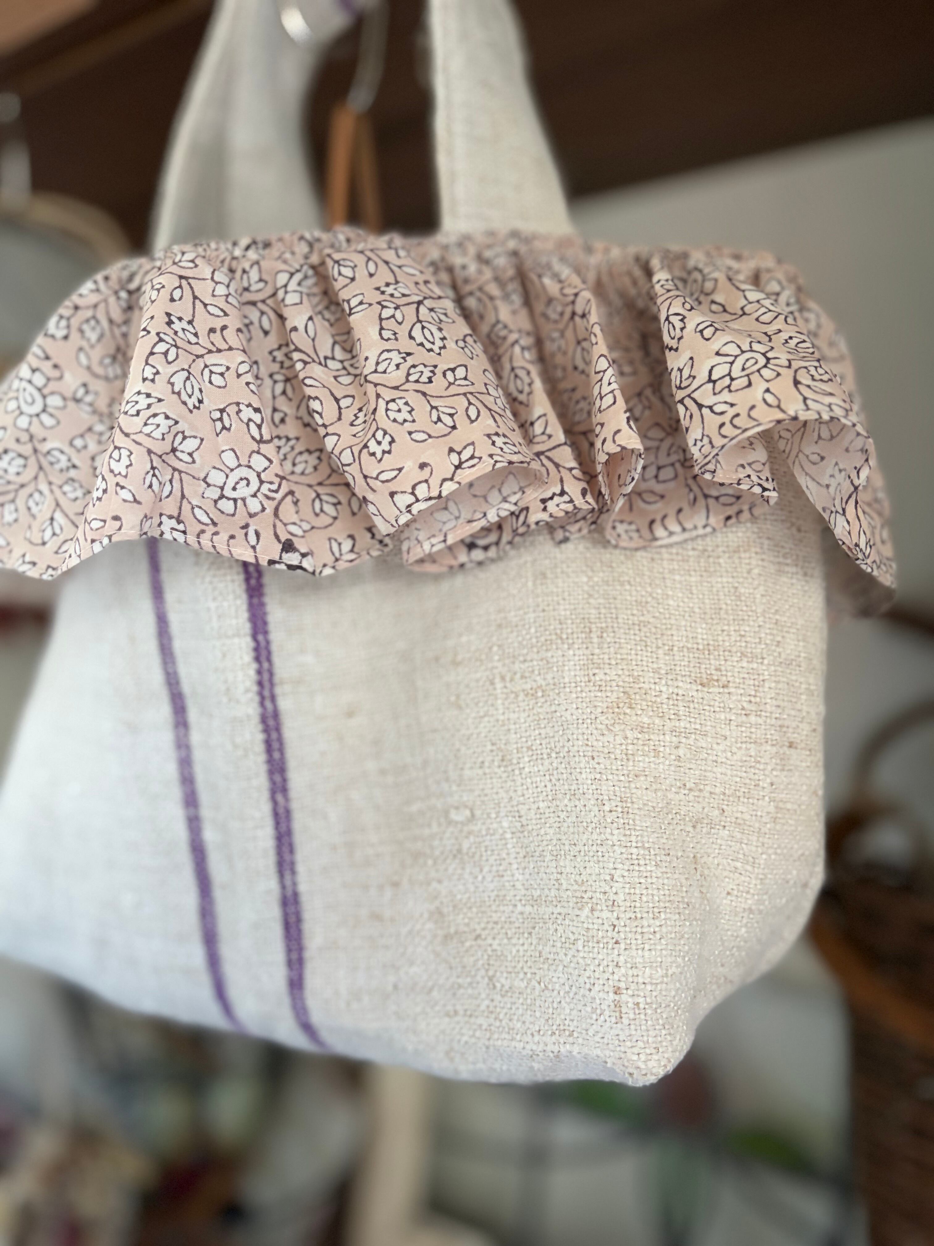 Grain Sack× block print frill tote bag♡ beige×écru×lavender