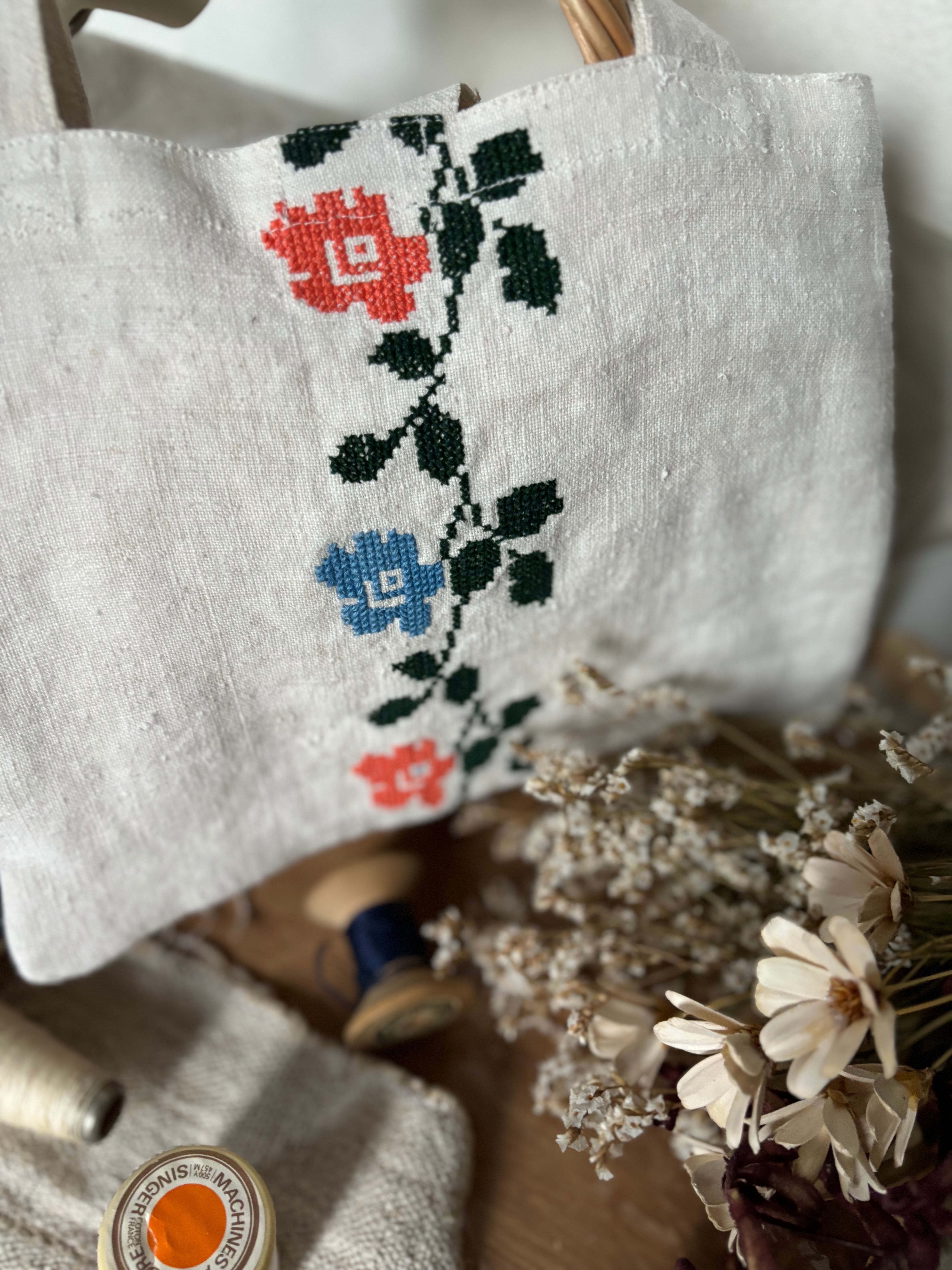 ハンガリアンリネン お花柄刺繍ミニトート➂