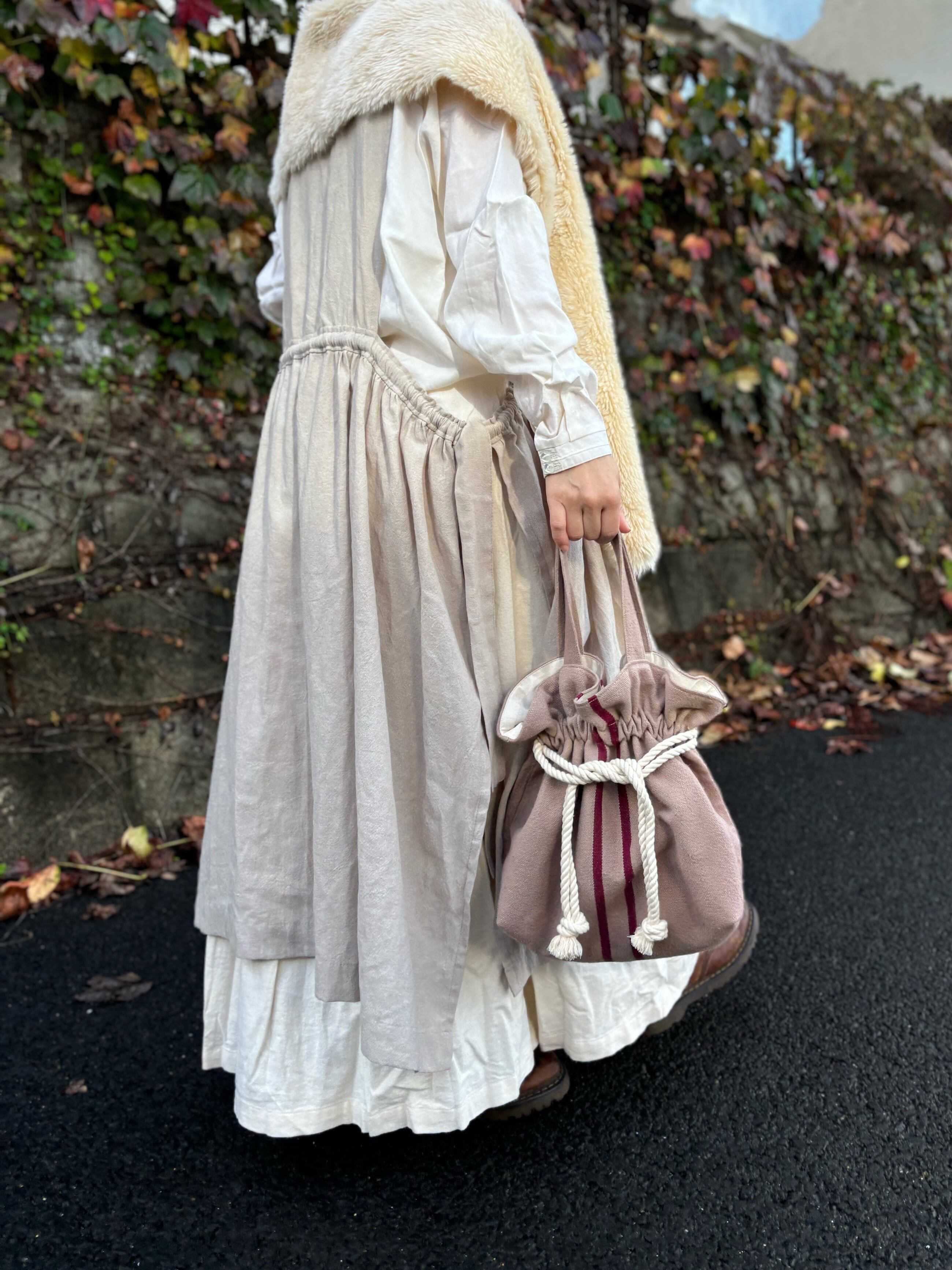 アンティークリネンを使用したこの巾着バッグは、優しい風合いとナチュラルなカラーリングが日常のスタイルに彩りを与えてくれるアイテムです!