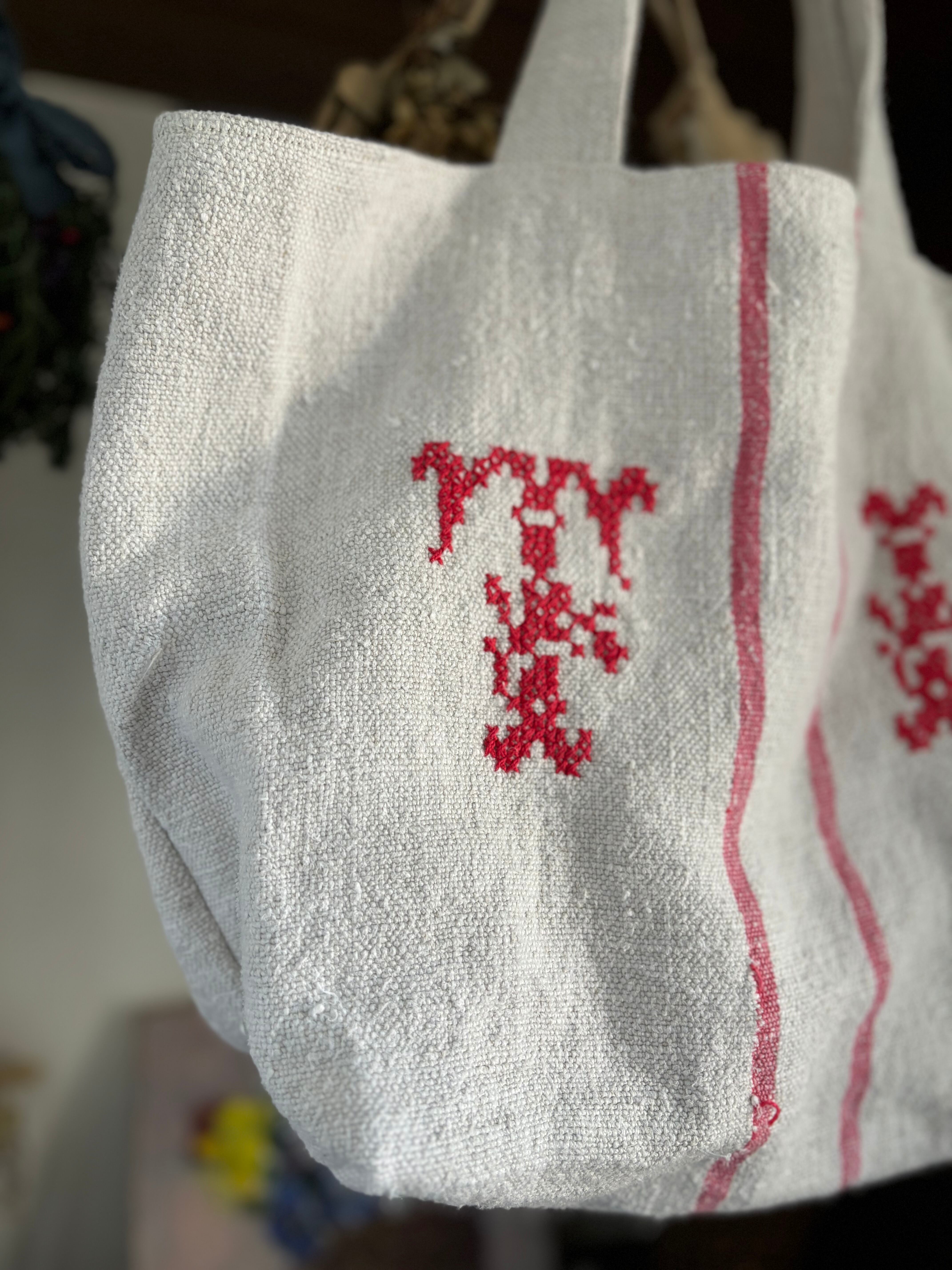 このトートバッグはアンティークリネングレインサックを使用し、上品なモノグラム刺繍が施されています。独特の風合いが日常のスタイルに特別感を添えてくれます!