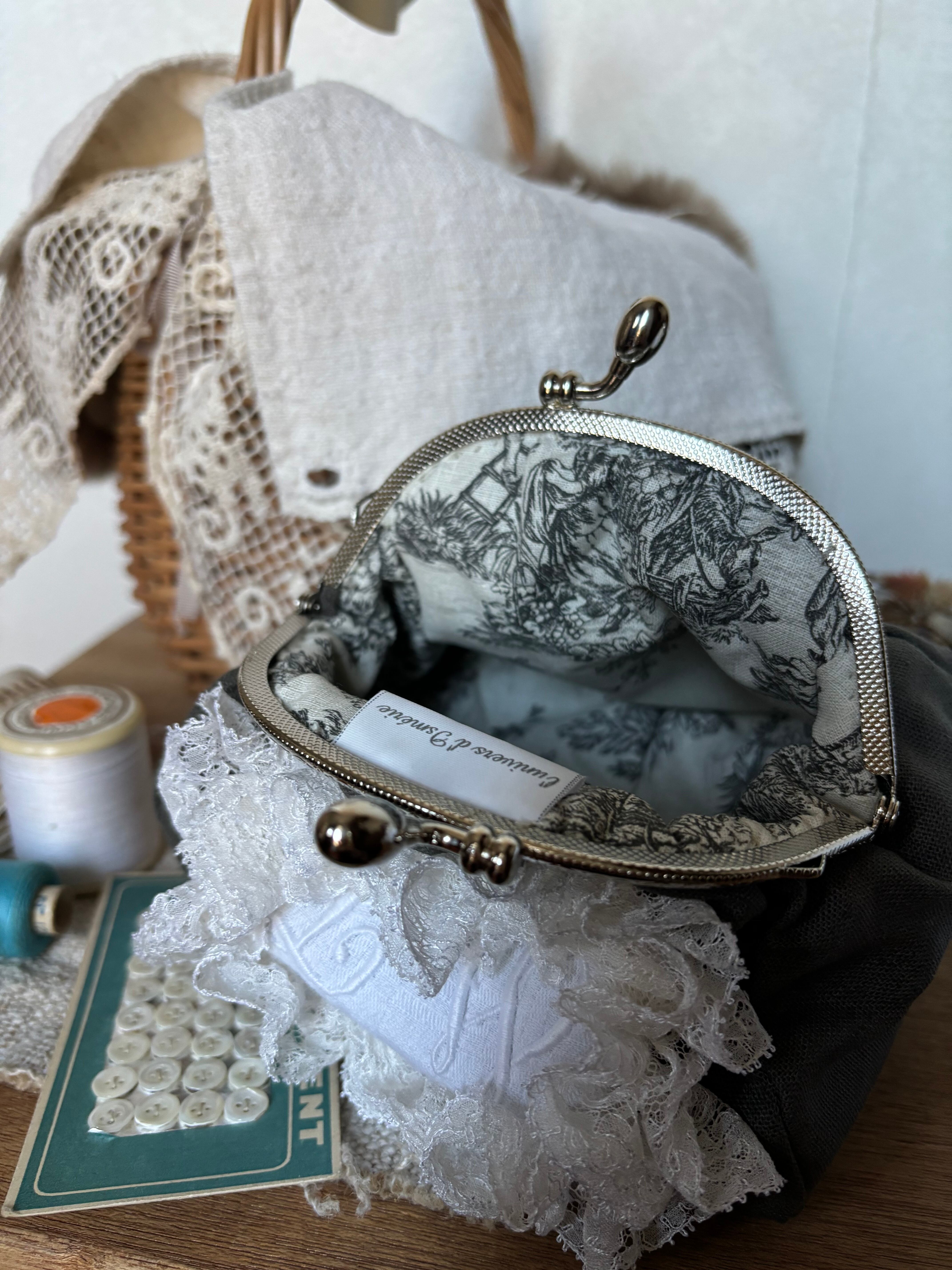 このポーチは、フランス製のリネンとモノグラム刺繍を施したリネンクロスとアンティークレースを組み合わせ、裏地はトワルドジュイのコンビネーションで、とっても贅沢なコラボレーション。