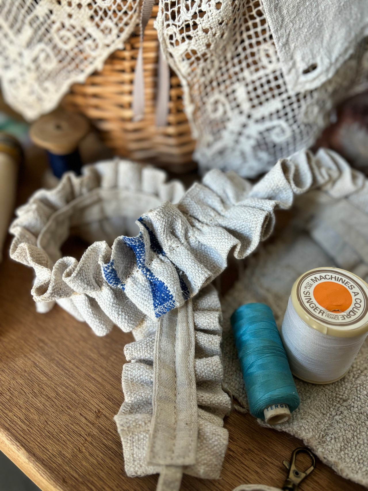 ♡Tさま専用♡ アンティークリネン フリフリスマホショルダー♡青
