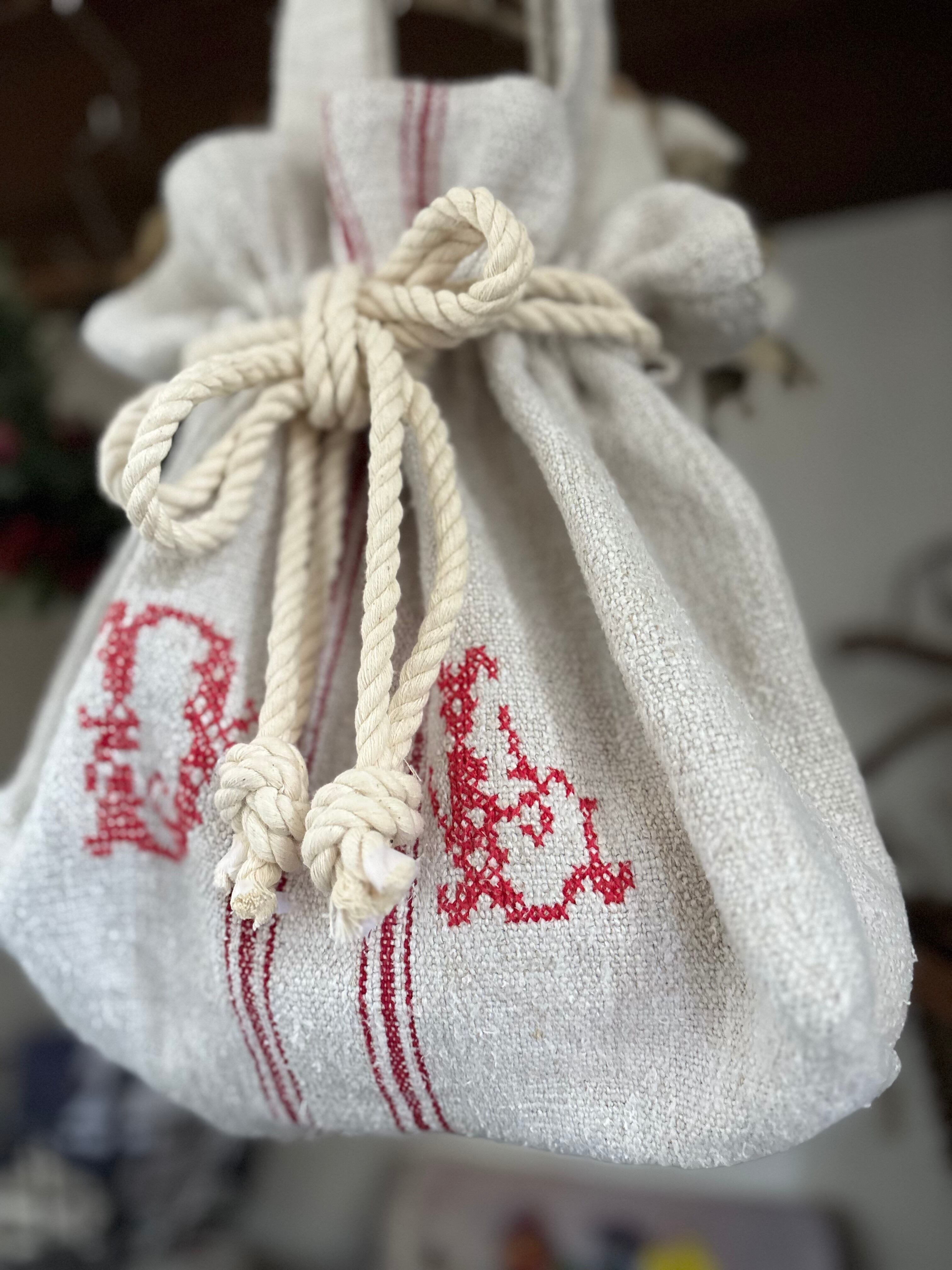 このコロンと巾着バッグは、魅力的なアンティークリネンを使用し赤いラインが際立つデザインが特徴です。優雅なモノグラム刺繍が施されており、シンプルながらも印象的な存在感を放つアイテムです!新たな季節にふさわしいスタイルが、あなたのコーディネートに特別なアクセントを際立たせてくれます。