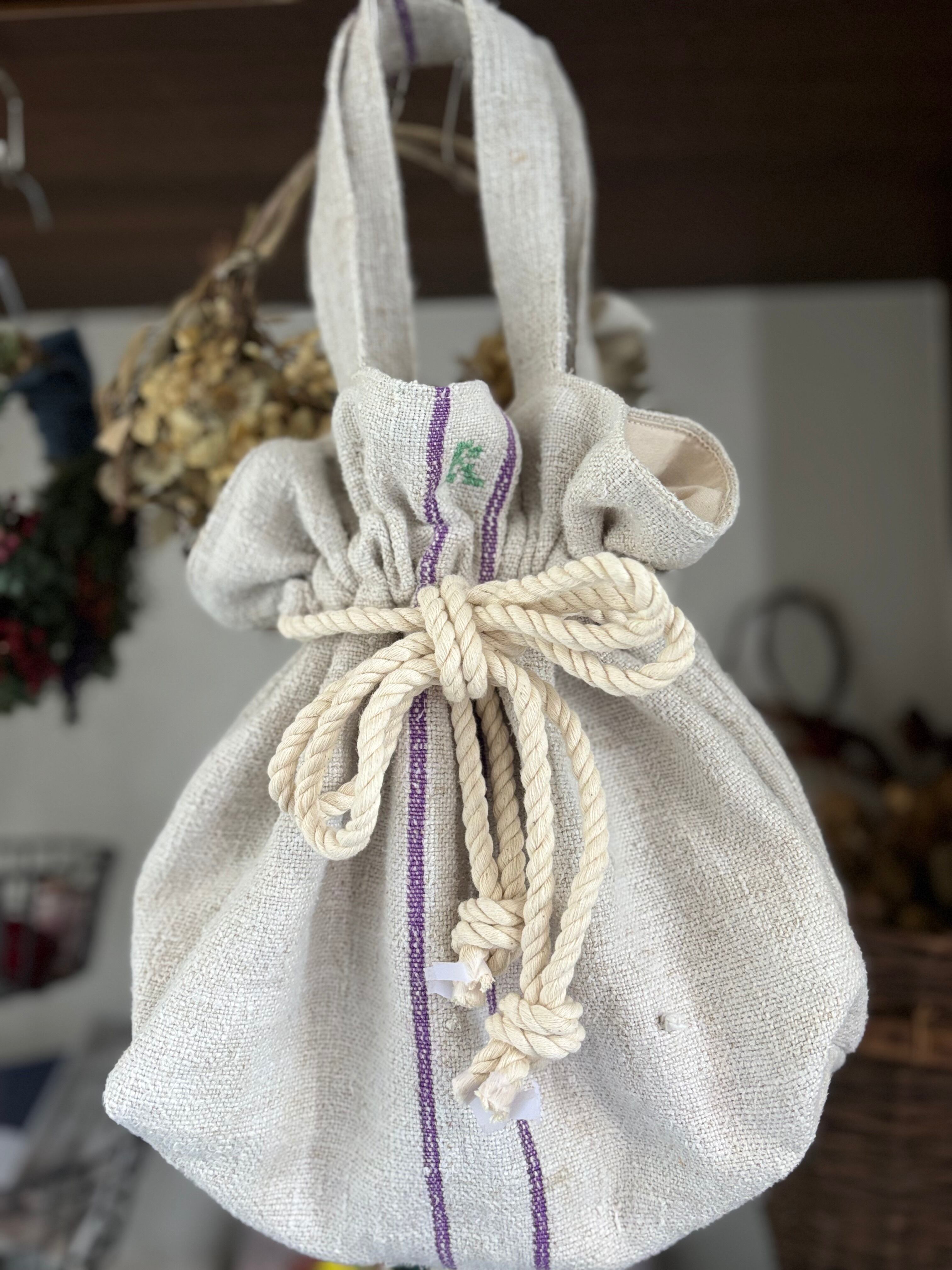 このバッグは魅力的なアンティークリネングレインサックを使用し、ラベンダーラインがとっても珍しい子です。シンプルながらも独特の存在感を漂わせるアイテムです!新しい季節にぴったりなデザインは、あなたのコーディネートに特別なアクセントを加えてくれることでしょう。
