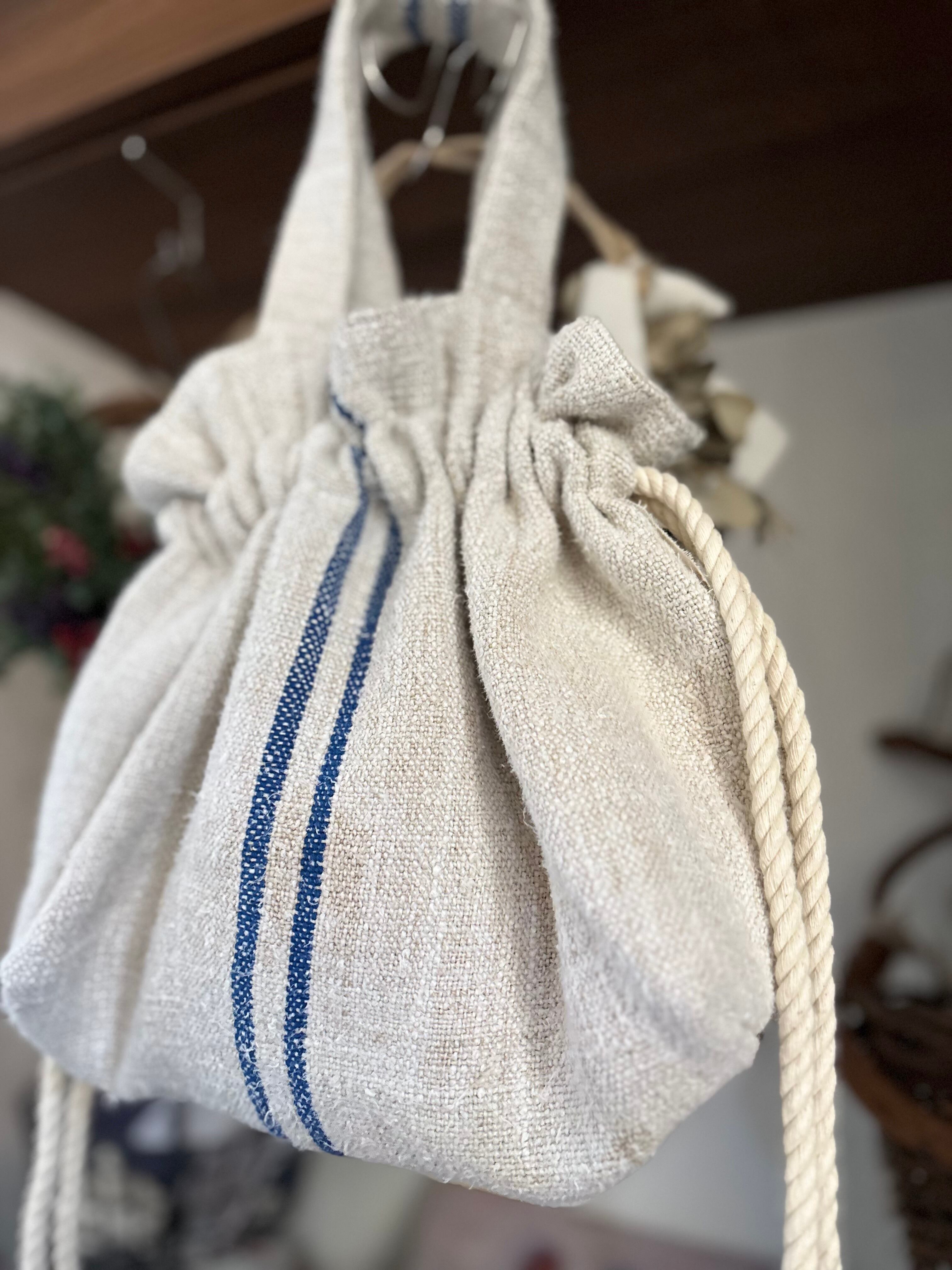 この巾着バッグは、魅力的なアンティークリネン素材とグレインサックをアップサイクルしたバッグです。