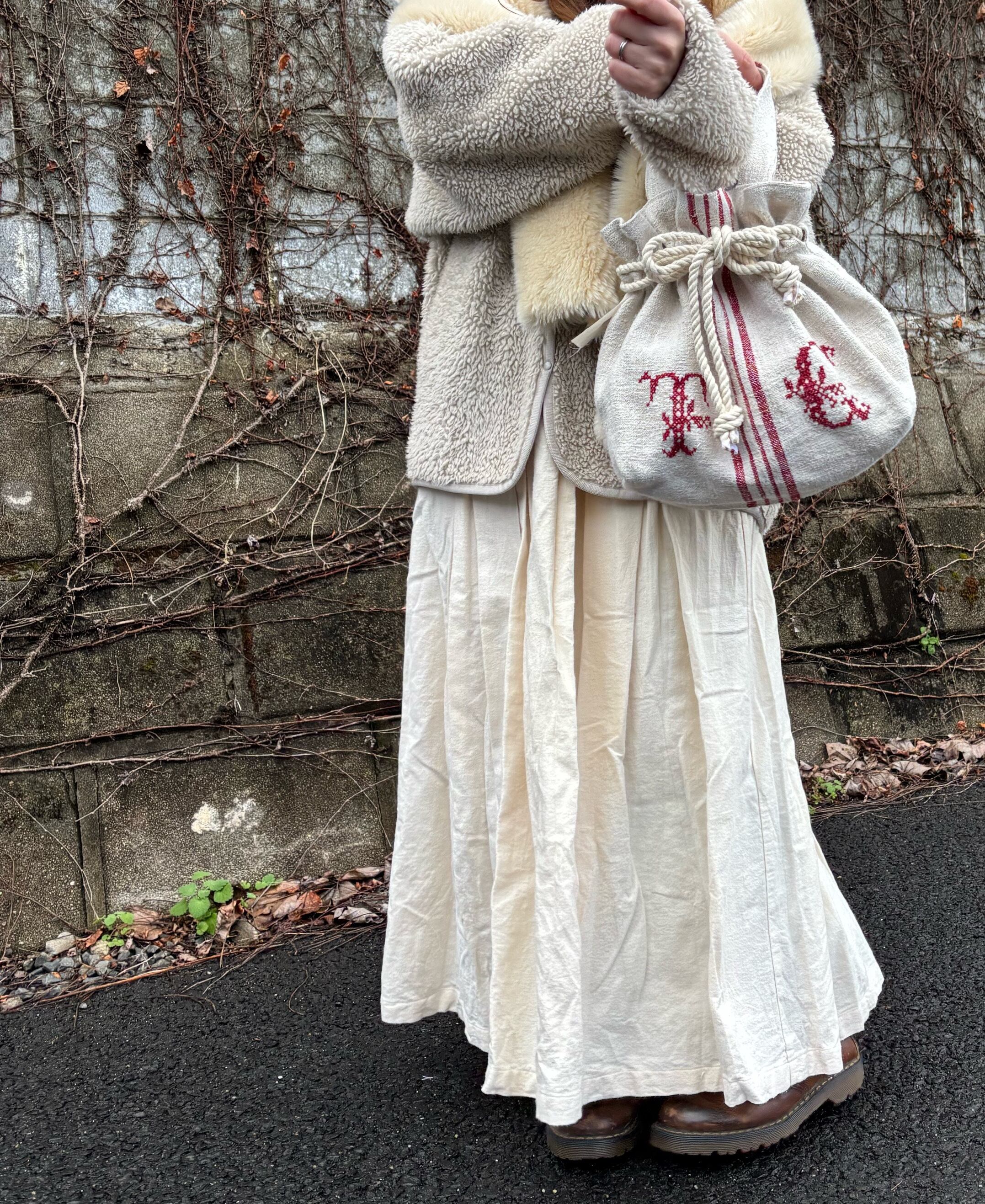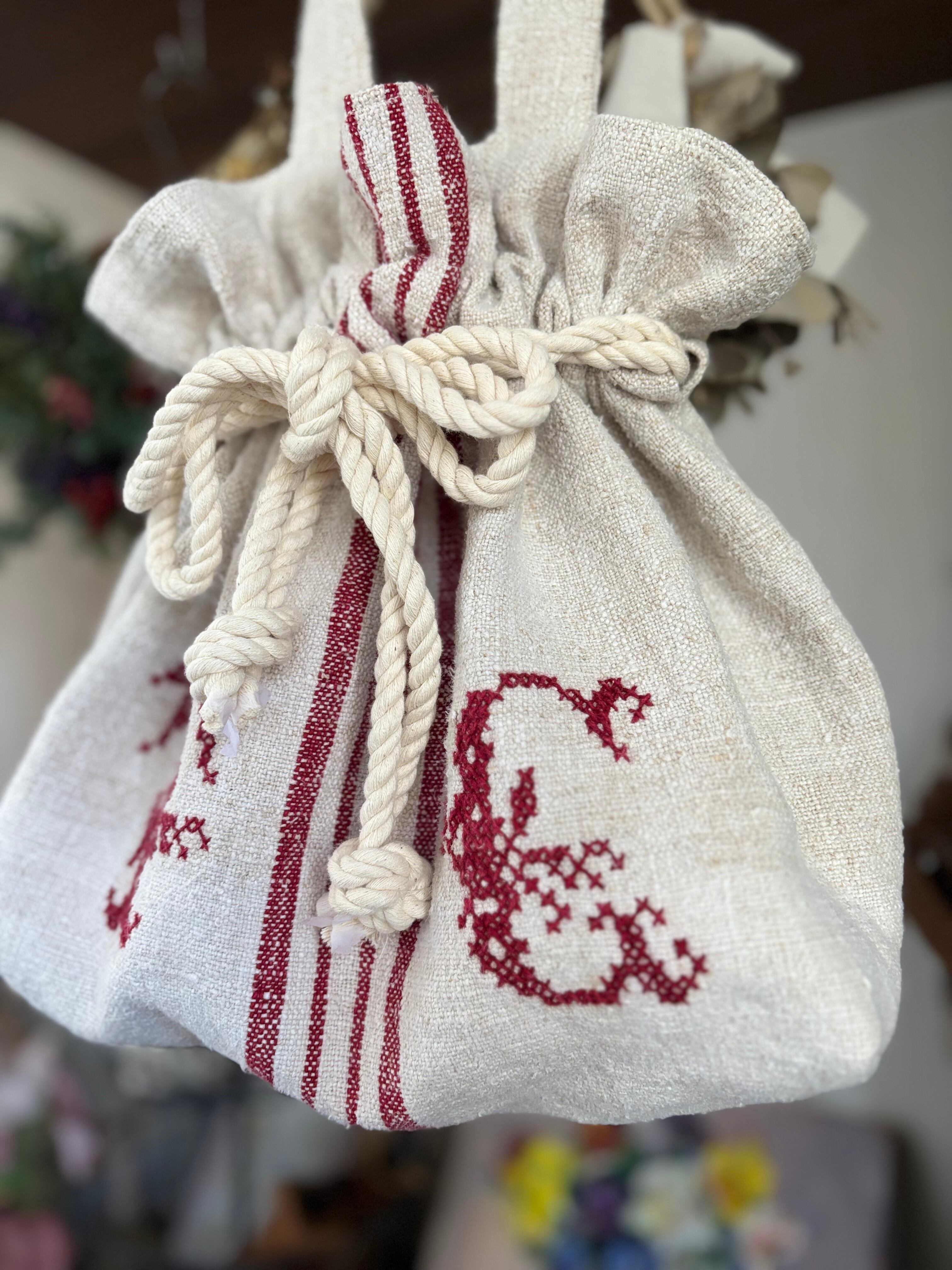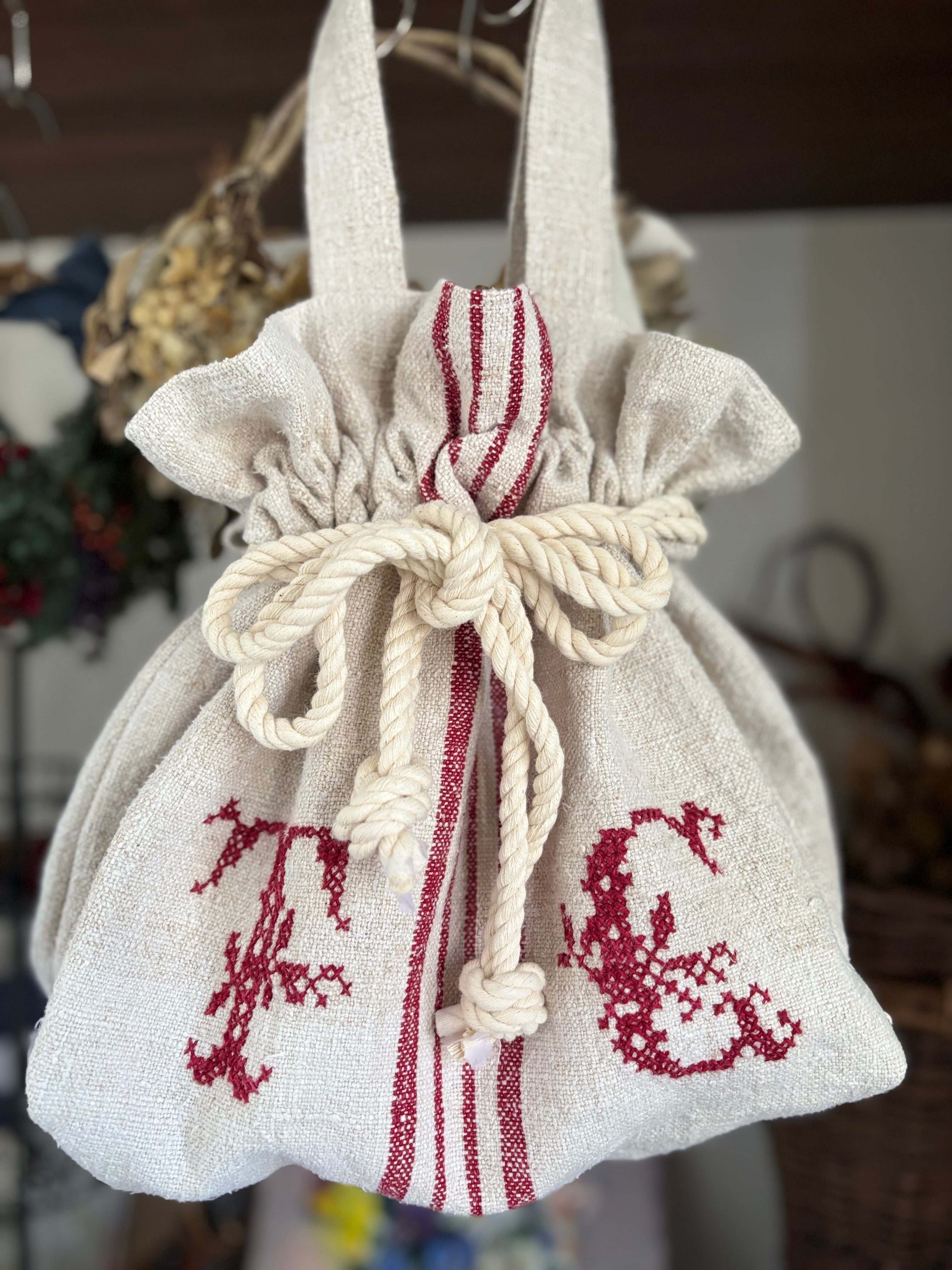 この巾着バッグは、特別なアンティークリネン素材とグレインサックを使用したデザインが特徴です。大きなモノグラム刺繍が施され、鮮やかな赤ラインが鮮やかに映え、上品でありながらも個性的な存在感を持つアイテムです!季節を問わず、あなたのコーディネートに特別なアクセントをプラスしてくれることでしょう。
