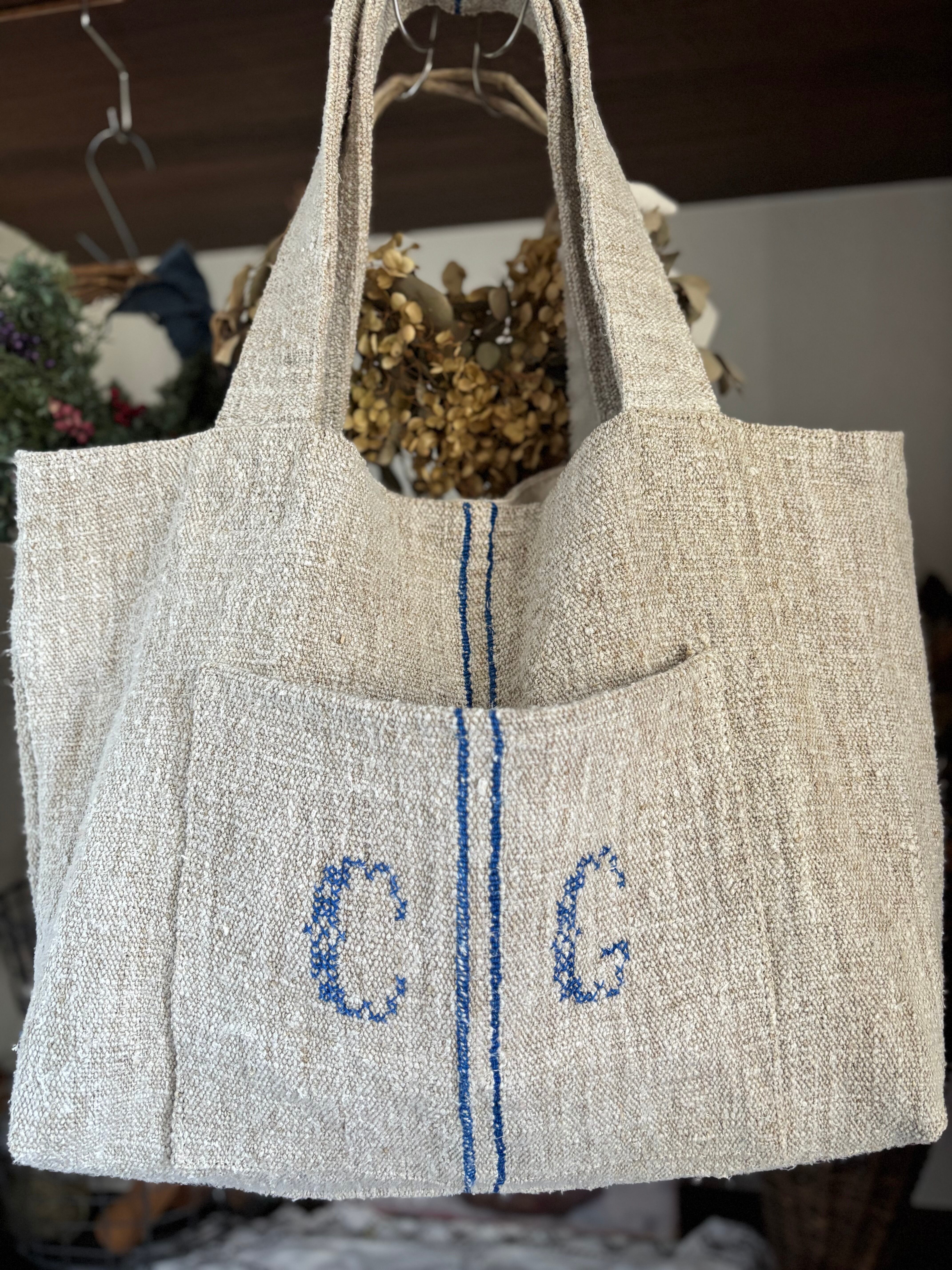 web shop限定♡アンティークリネン♡大人気モノグラム刺繍×ブルーライン中トート
