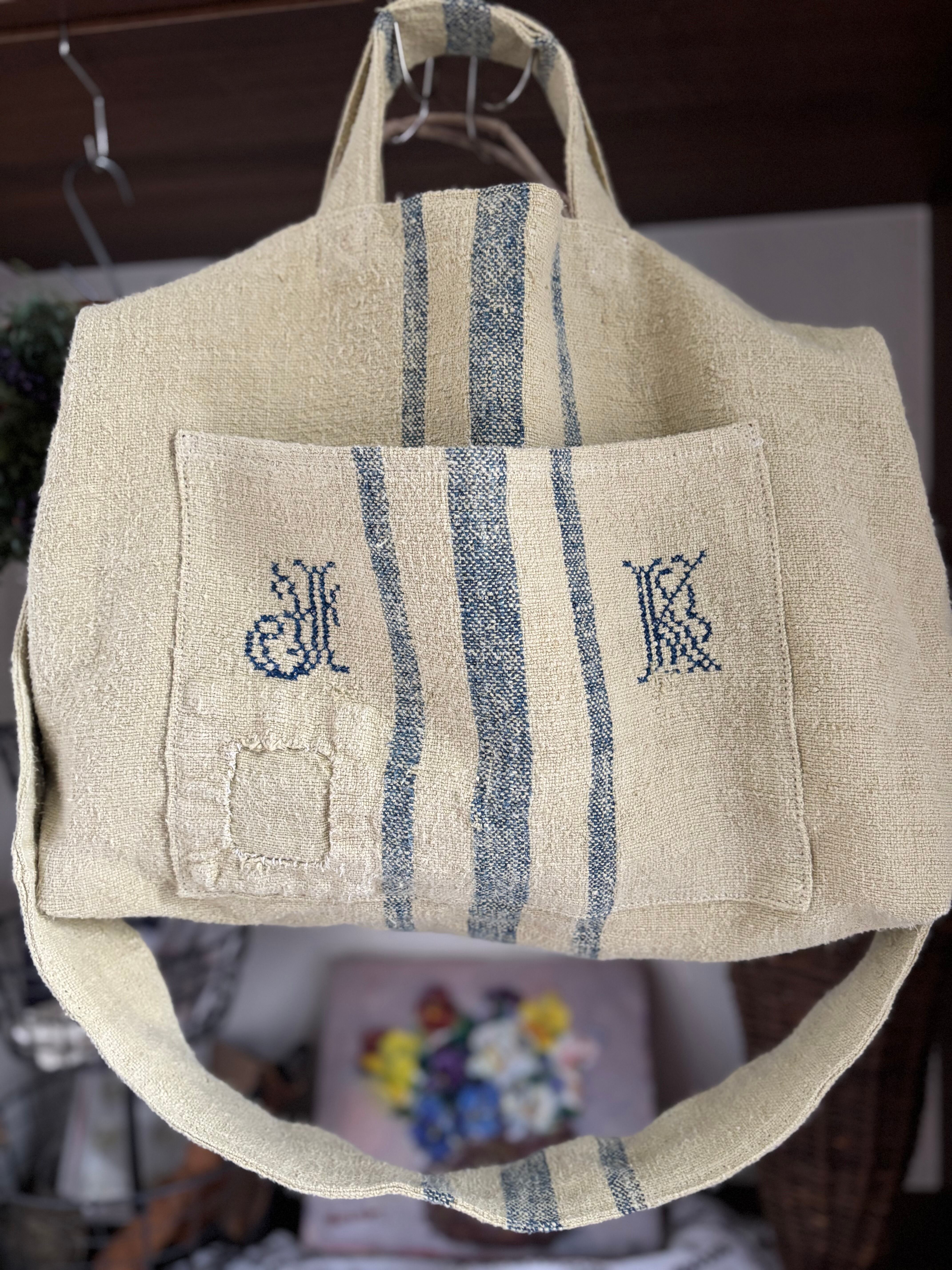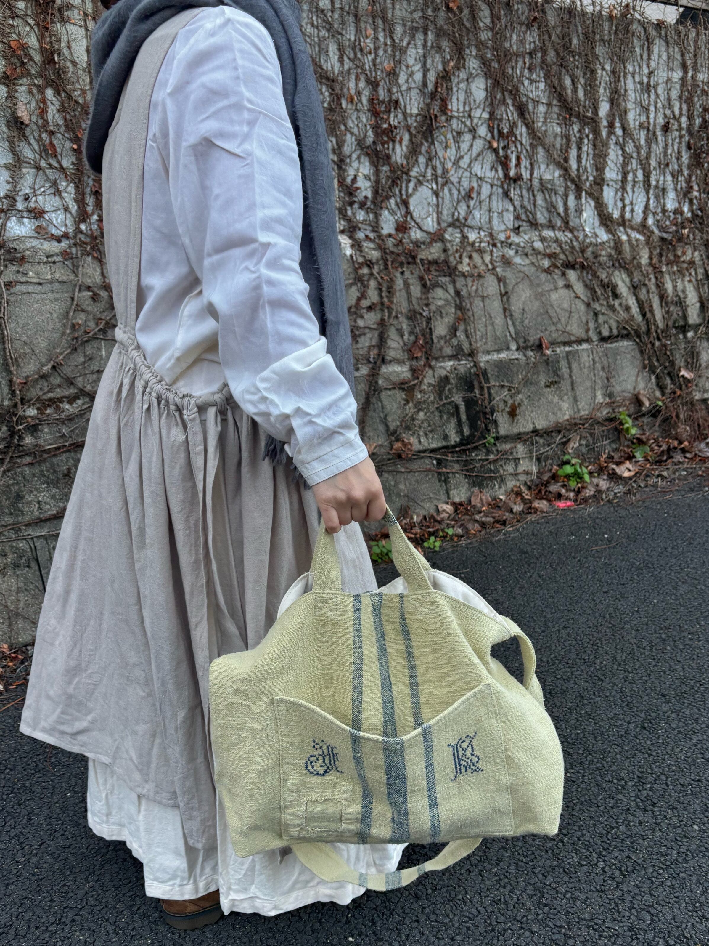 このトートバッグは、珍しいレモンミルク色と大人気のブルーラインを組み合わせた唯一無二のデザインが特徴です。つぎはぎで表現されたアンティーク感が際立ちながらも、上品な印象を与えるアイテムです!日常使いはもちろん、特別な日のお出かけにもピッタリなアクセントを加えてくれることでしょう。