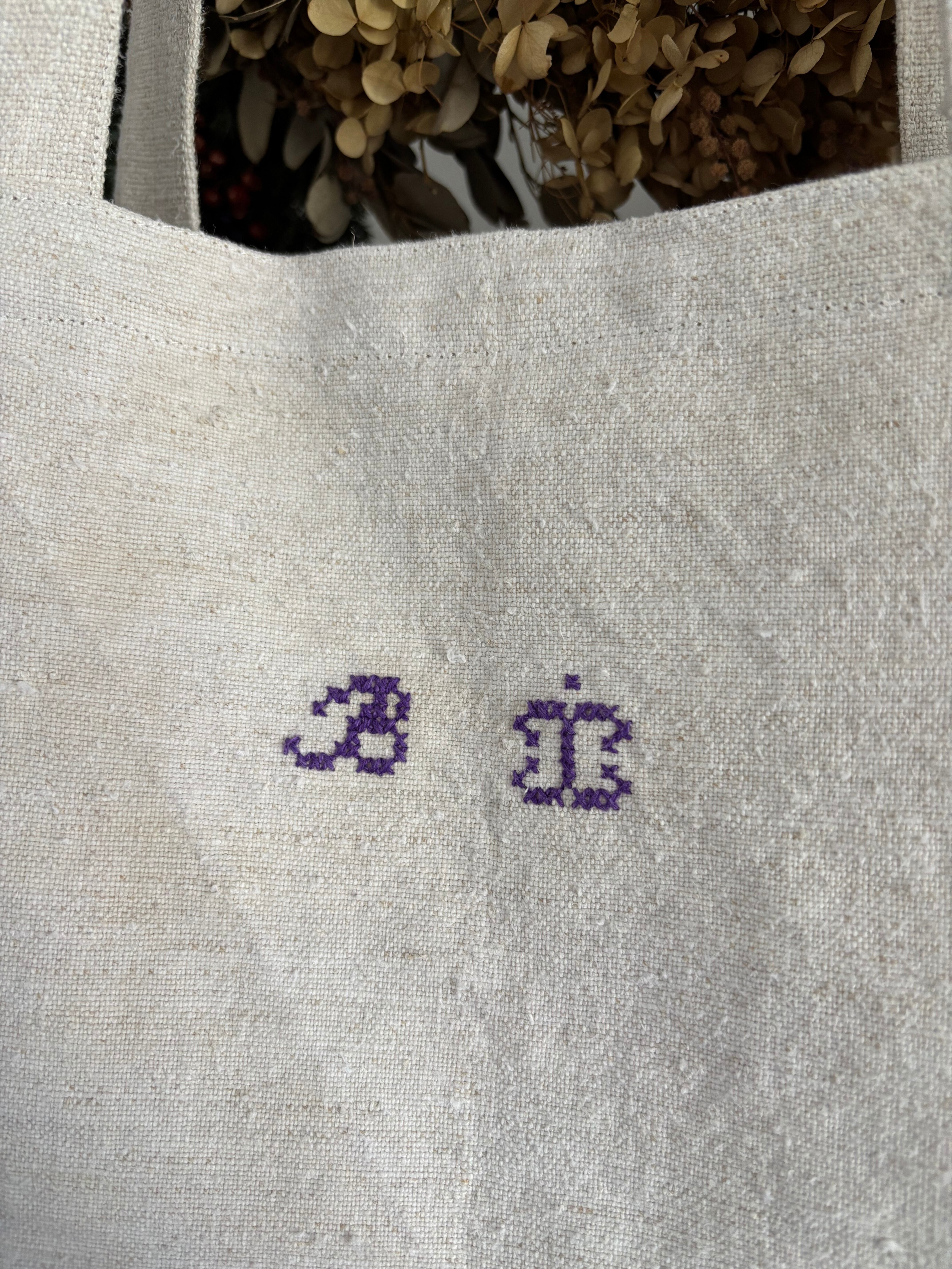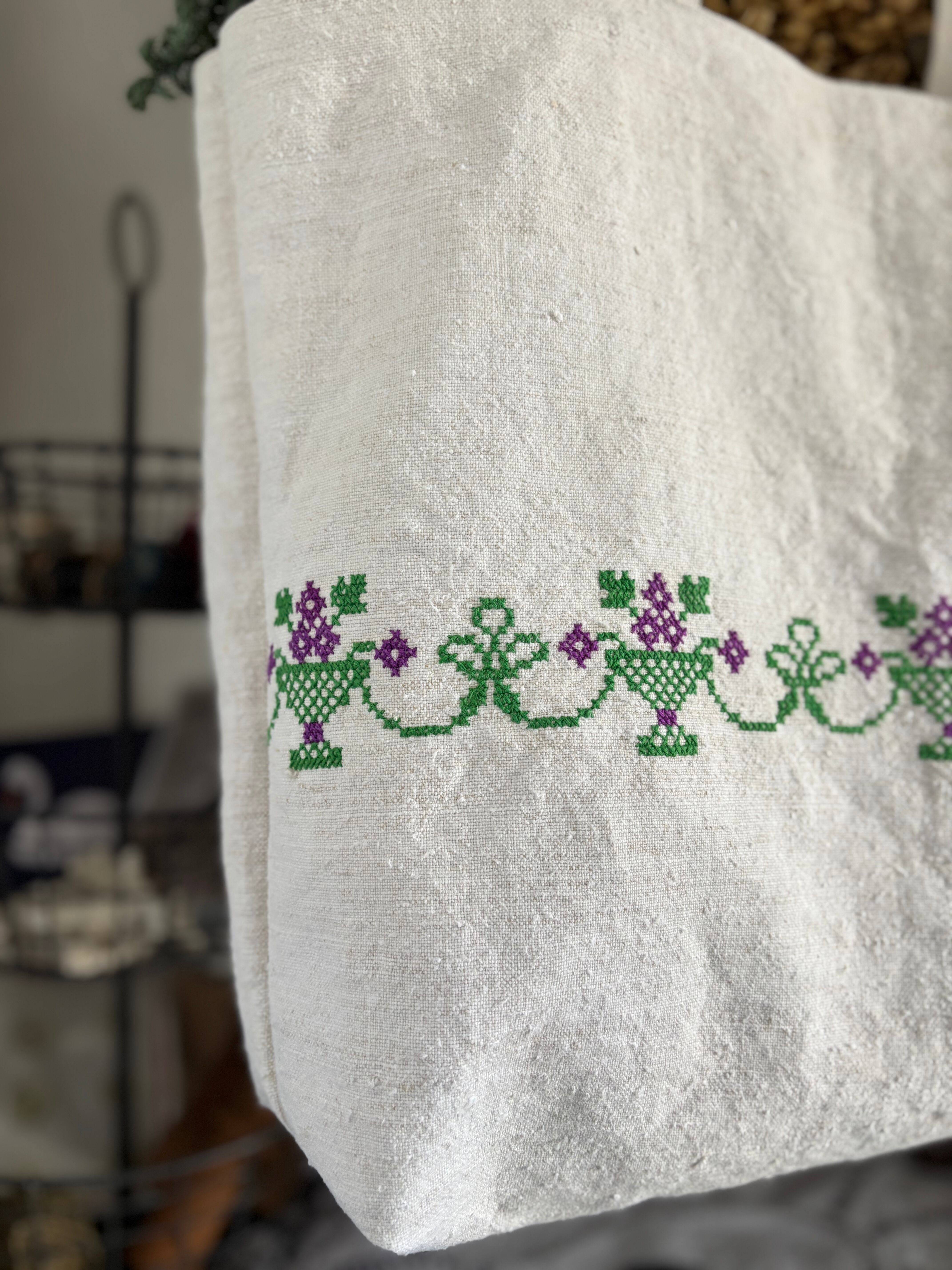 美しいグリーンとパープルのクロス刺繍が施されたアンティークハンガリアンリネン素材を使用し、可愛らしさと上品さを兼ね備えたトートバッグに仕上がりました。