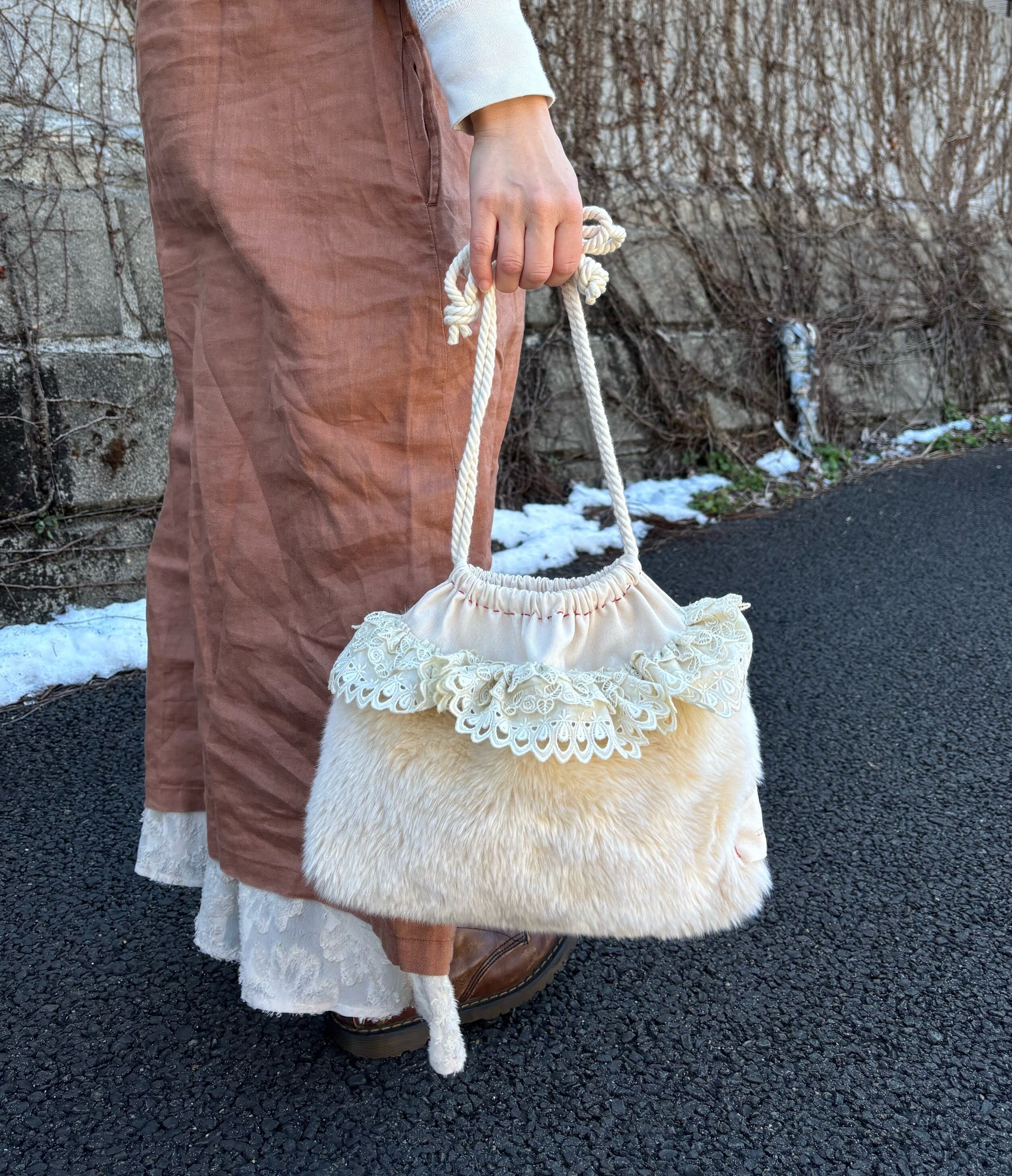 この特別な商品は、今季限定でお届けするアンティークレースとモフモフの巾着とつけえり風マフラーのセットです。美しいオフホワイトのカラーリングが、どんなコーディネートにもぴったりフィットします。